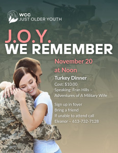 NEXT EVENT: November 20th at noon! ‘We Remember’ Cost is $10. Don’t forget to bring a friend! Sign up in the foyer!