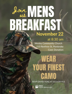 Upcoming Men’s Events: Men’s Breakfast on Saturday, November 22nd at Wesley Community Church. Begins at 8:00am